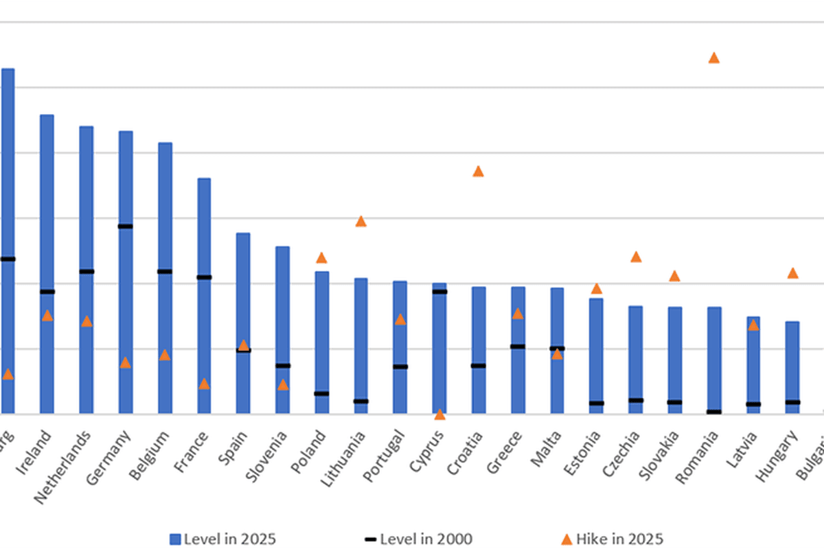 In 2000, the minimum wage level in Luxembourg was more than 47 times higher than in Romania. By 2025, the difference between the highest and lowest rates – Luxembourg and Bulgaria – has narrowed to just under five times. Twenty-five years ago, monthly minimum wage rates in many central and eastern European countries, including Romania, Bulgaria, Latvia, Estonia, Slovakia, were below €100. In others, such as Hungary, Lithuania and Czechia, they were only slightly above that threshold, with Poland reaching up to €161.