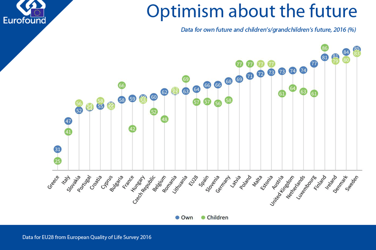 We should bear in mind that these findings are all relative and Germany remains amongst the most politically and socially stable countries in the world. However, the apparent disjoint between quality of life and quality of society, as reflected in the 2016 EQLS, is cause for reflection. Although Germans remain optimistic about their future, they are less optimistic about the future of their children and grandchildren – and it seems that their optimism is being dampened by societal rather than economic concerns.
