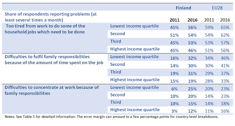 However, the EQLS 2016 results regarding work–life balance reveal that combining life and work in Finland today is proving quite challenging – and the findings are especially worrying for women and people in the lowest income quartile.
