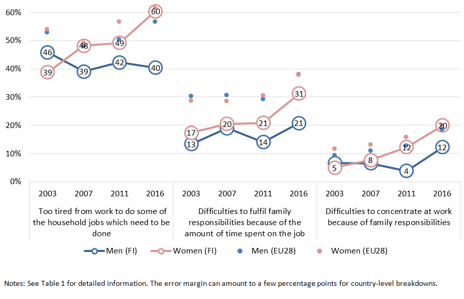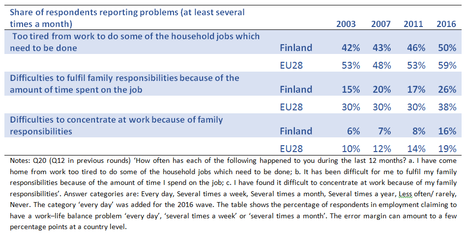 Work–life balance has declined during the last decade in Finland, based on the three specific indicators of the EQLS. One in two respondents (50%) was too tired from work to do household jobs at least several times a month, an increase of 8 percentage points since 2003. Additionally, 26% of respondents had difficulties in fulfilling family responsibilities because of work (increase of 11 points from 2003). The least common work–life balance issue, ‘difficulties to concentrate at work because of family responsibilities’, has also more than doubled in a decade: while in 2003 only 6% of respondents in Finland experienced this problem, in 2016 the share was 16%.