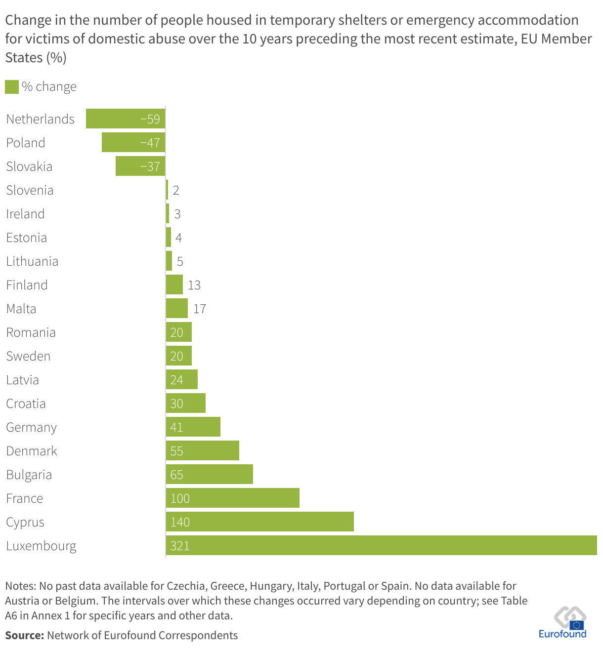 Change in the number of people housed in temporary shelters or emergency accommodation for victims of domestic abuse over the 10 years preceding the most recent estimate, EU Member States (%)