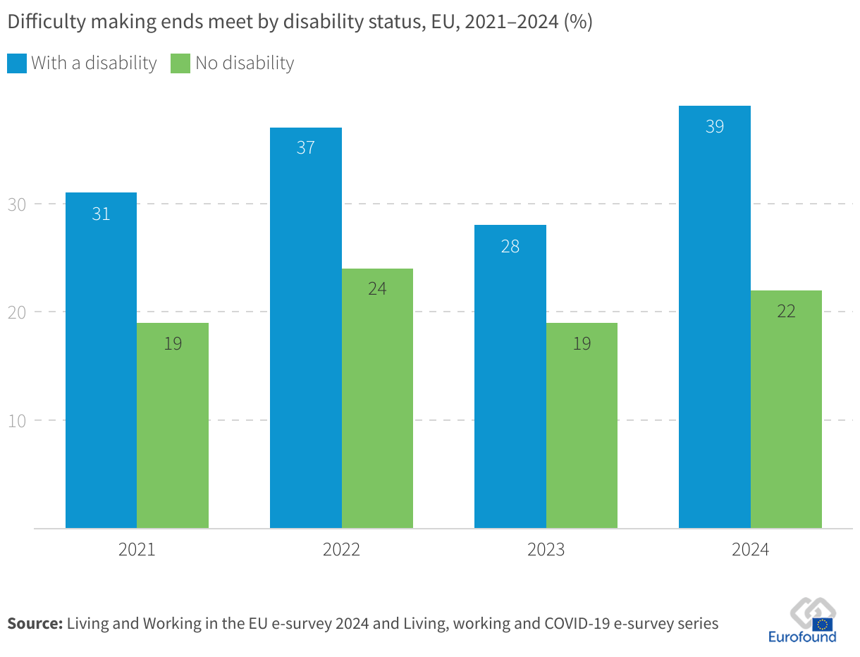 Difficulty making ends meet by disability status, EU, 2021–2024 (%)