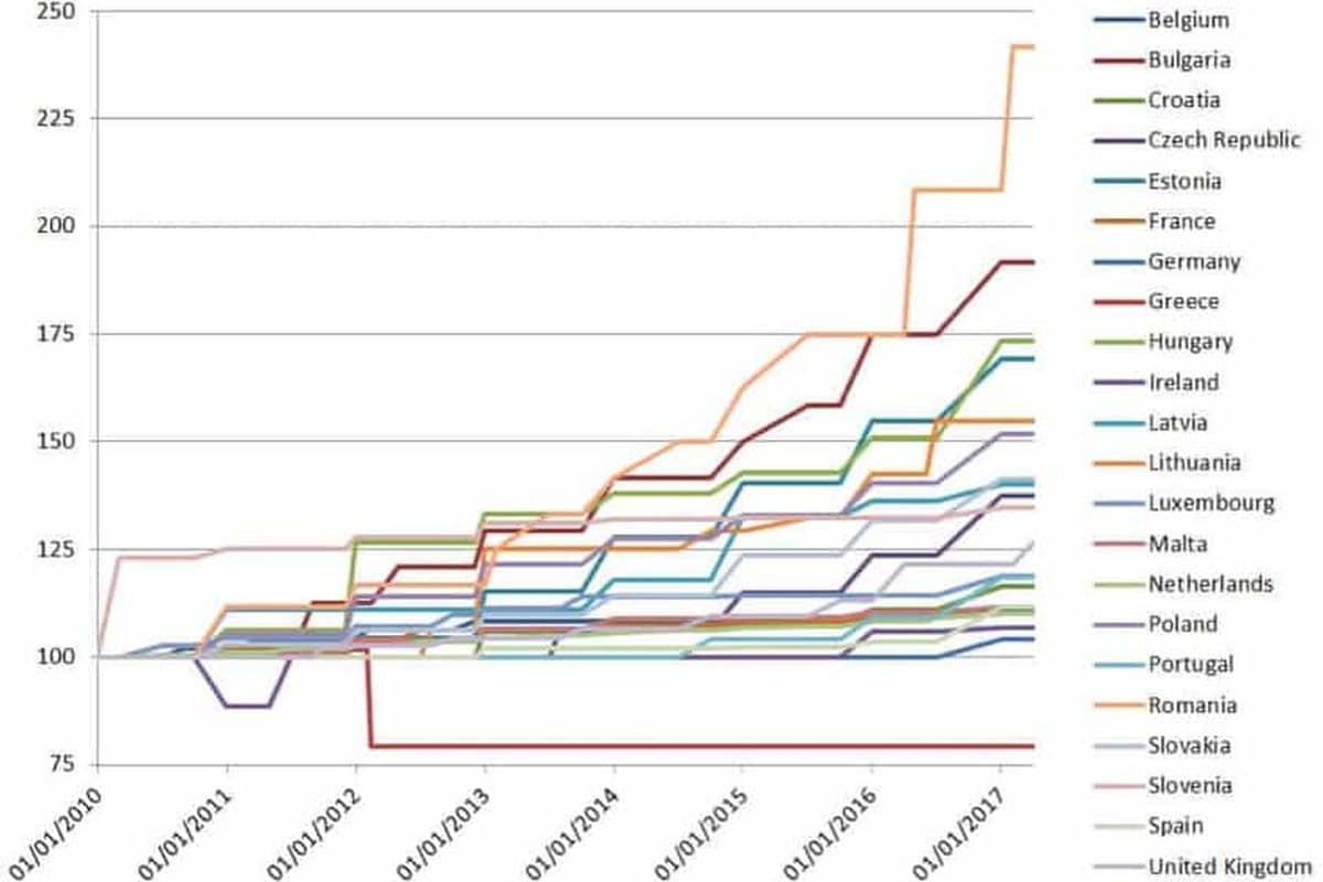 According to EurWORK’s article on Statutory Minimum Wages in 2017, growth in minimum wages in the EU has accelerated this year compared to the previous year. This development is consistent with recent progressive developments in average nominal compensation per employee and in collectively agreed wages. Fifteen out of 22 EU countries with general statutory minimum wages implemented greater increases during 2016–2017 than 2015–2016. Newer member states generally experienced a more pronounced growth than the majority of other EU countries, with Romania, Hungary and the Czech Republic leading the charge and with increases reaching up to 38% in Romania. Within the EU-15 minimum wages grew most in Spain (up 8%).