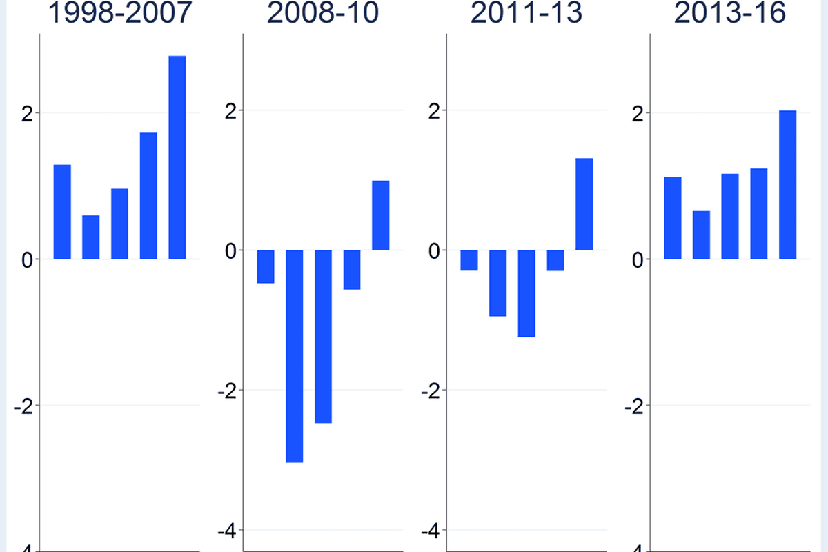 Source: European Jobs Monitor Annual Report 2017, P.11. In each chart, quintile bars represent employment shifts in jobs accounting for, in sequence, the lowest-paid 20% of employment on the left to the highest-paid 20% of employment on the right